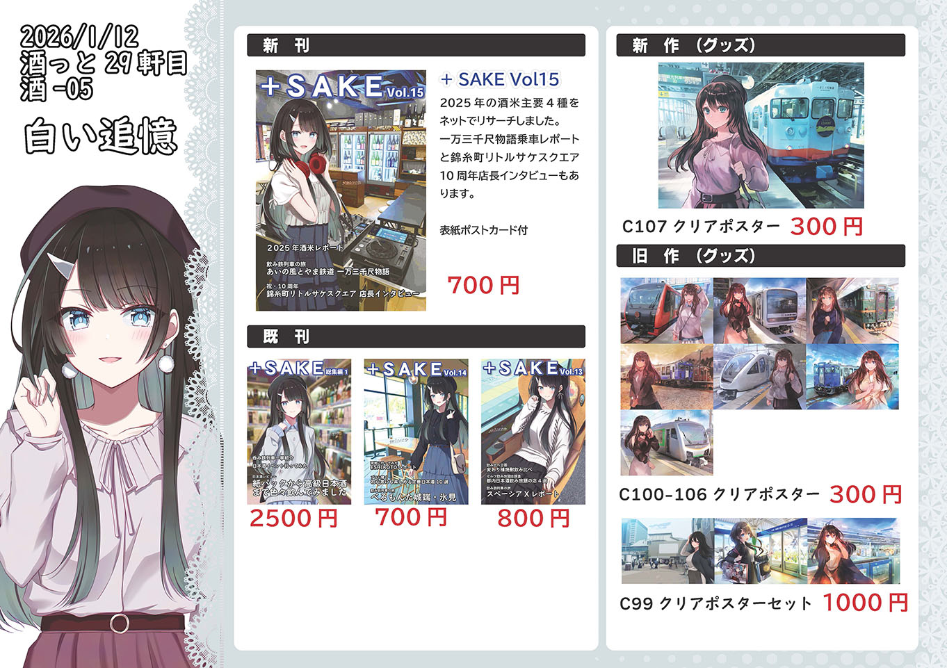 新刊は1部700円、新作クリアポスターは500円(乗車券袋1枚付き)、C100~C106までのクリアポスターのセットが2500円(乗車券袋2枚付き)となります。